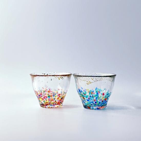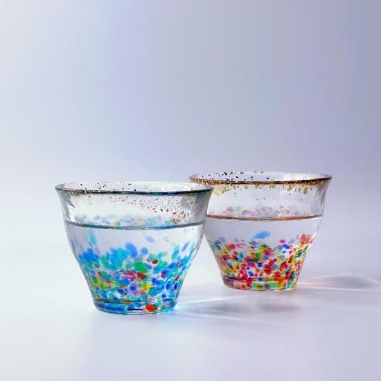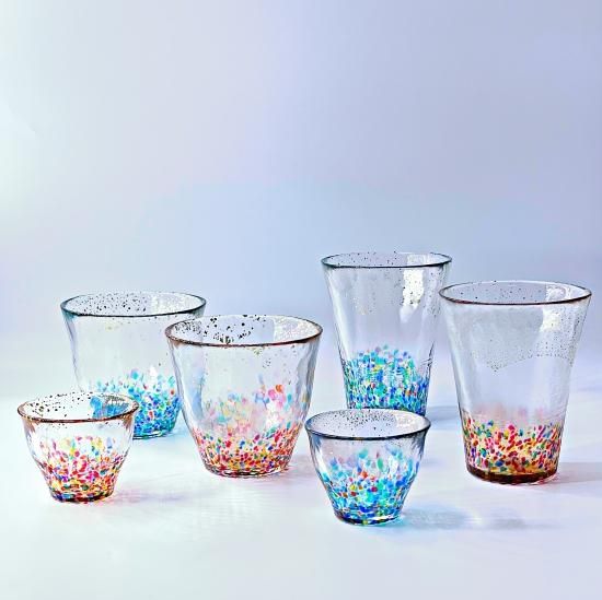 朱や橙などの散りばめられた色粒が、夜空を彩る花火の一瞬の輝きと繊細さをイメージさせるとっても素敵なガラス器です。