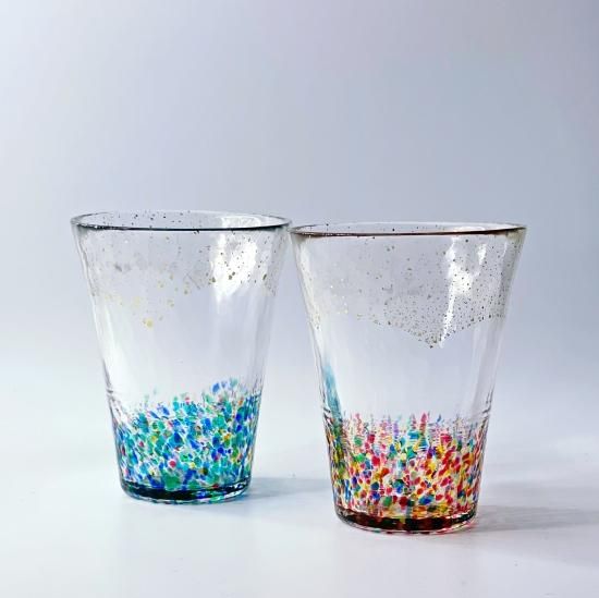 ほの明るい宵の色にも見える青のグラデーションに、祭りの華やかさを思わせる金彩があしらわれたガラス器です。