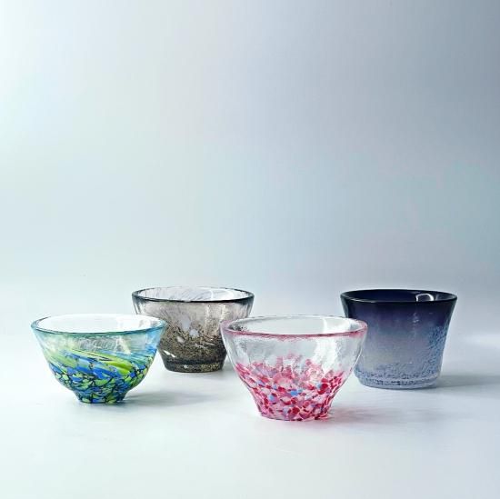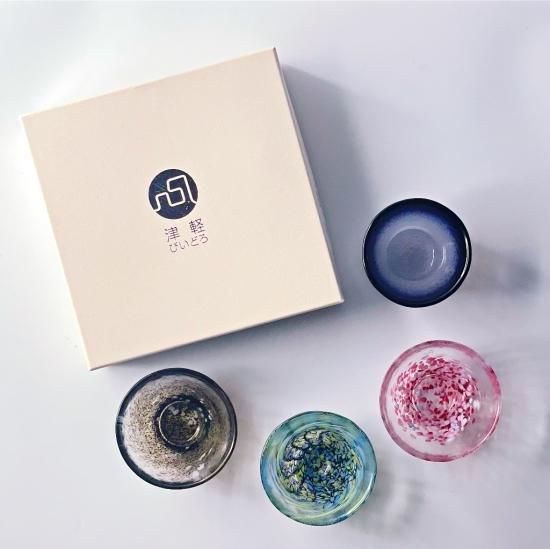 青森を代表する魚をモチーフに津軽びいどろの職人が色ガラスを調合して作られた「あおもりの肴盃」シリーズです。