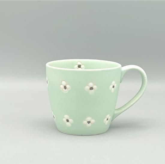 マットな仕上がりのパステルカラーに白小花が散りばめられたやわらかでとってもかわいらしい器です。