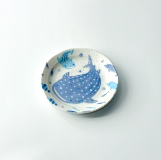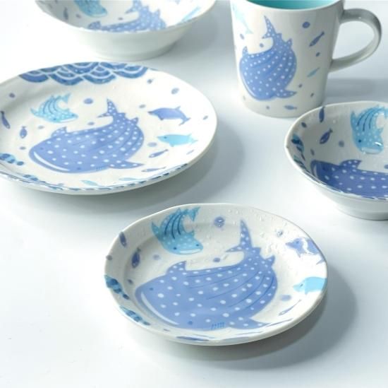 キラキラ輝く海を仲間たちと泳ぐジンベエザメがとってもかわいい器です。
