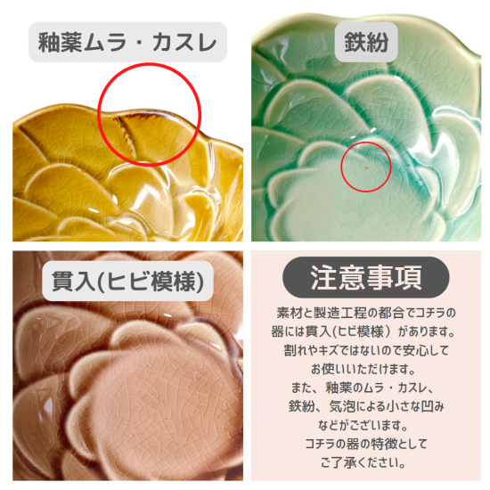 また、非常に微妙な色合いを表現している器のため、同サイズ・同カラーでも仕上がりの色の出方などには個体差があります。ご了承の上ご注文をお願いします。