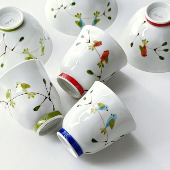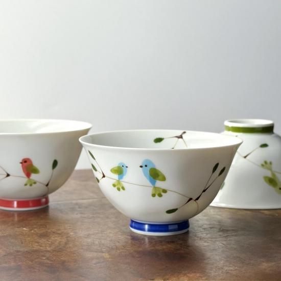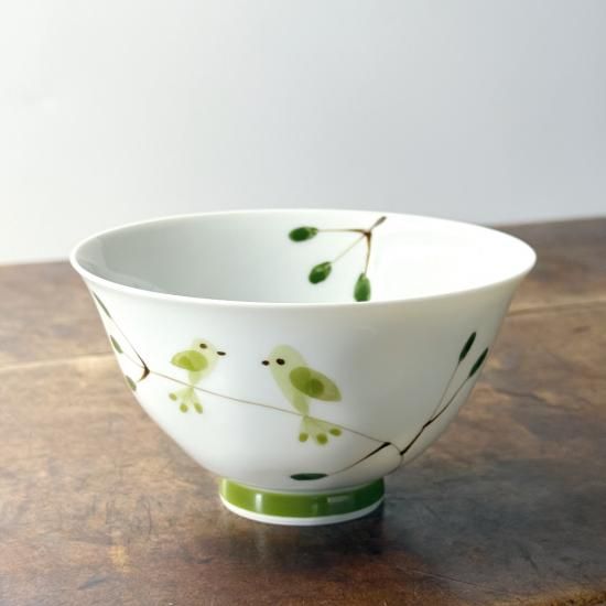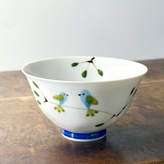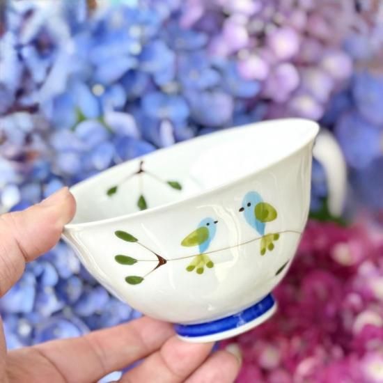 薄くて軽い白磁の飯碗に描かれる小鳥たちがとってもかわいい飯碗です。