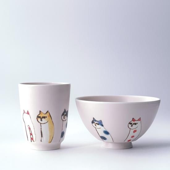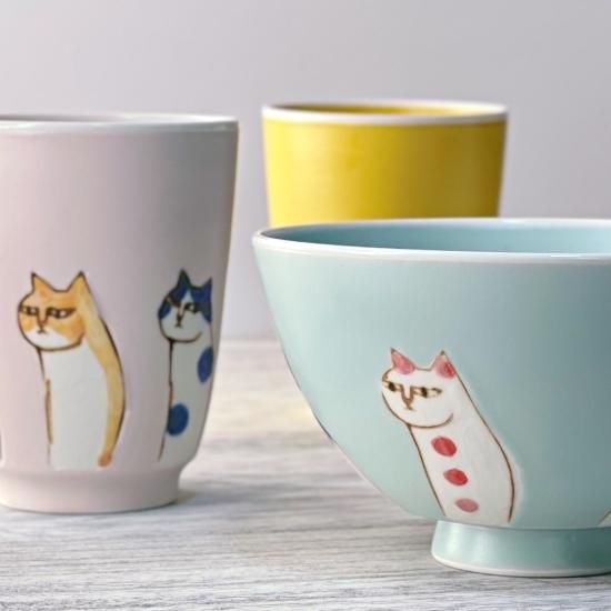パステルカラーのマット釉薬で仕上げられた器にデザインされたネコちゃんたちの表情がたまりません。