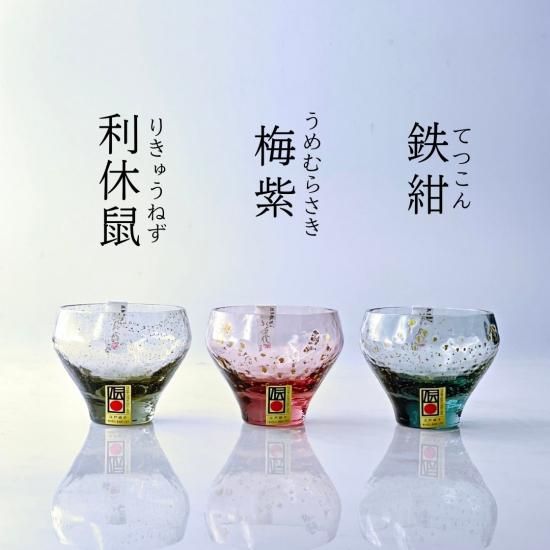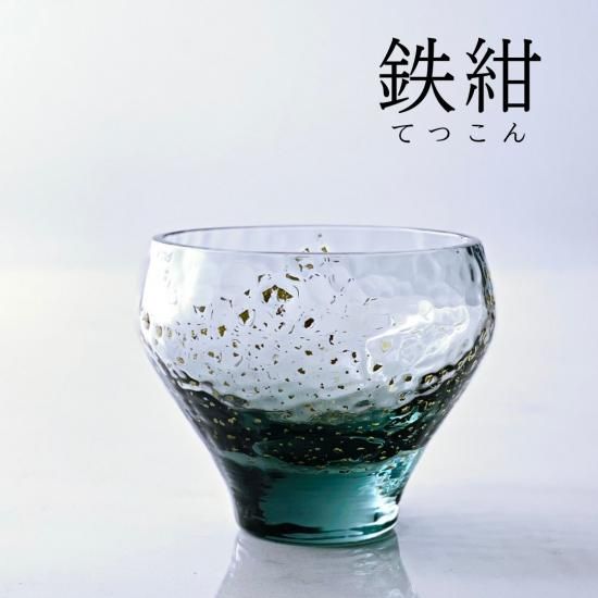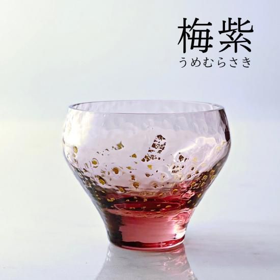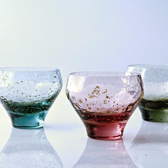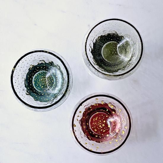 丸みを帯びた独特な形状に趣深い伝統色と散りばめられた金箔、ガラスならではの濃淡を活かしたとっても素敵な酒杯です。