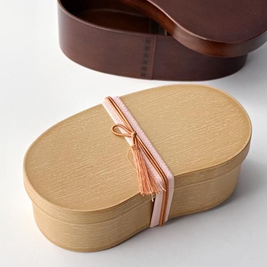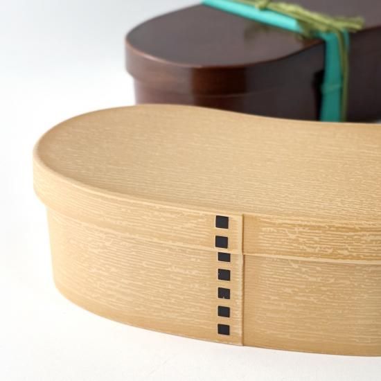 曲げわっぱの木目を基調とした和の風合いを感じる樹脂製の弁当箱です。