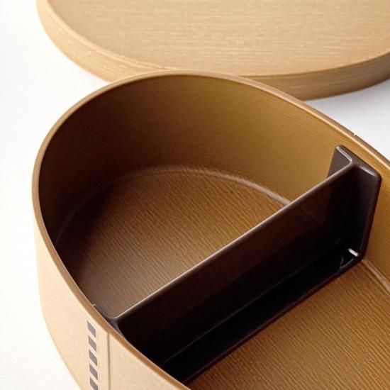 曲げわっぱの木目を基調とした和の風合いを感じる樹脂製の弁当箱です。